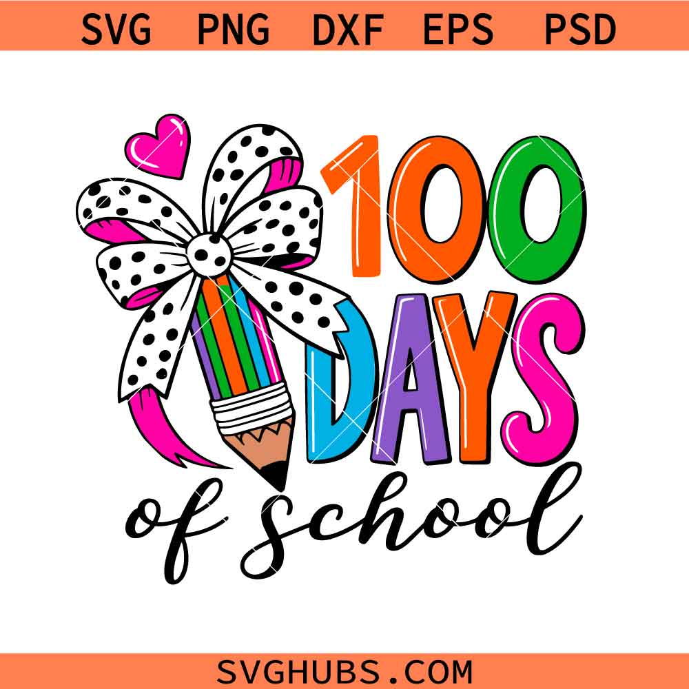 100 Days of School pencil bow svg png, 100 Days of School svg, Teacher shirt svg