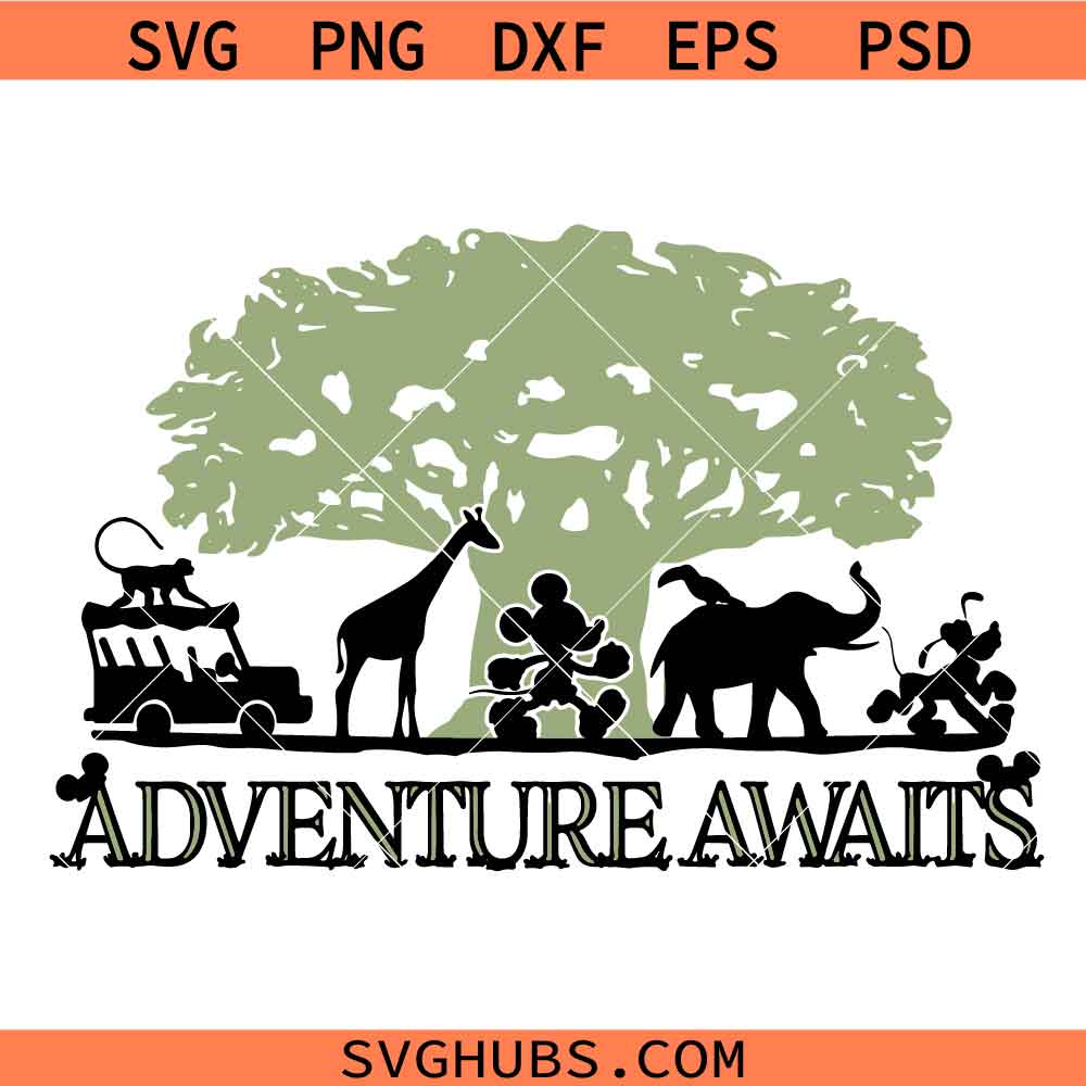 Adventure Awaits Monkey Elephant Mouse and Giraffe Trip Svg Png, Animal Kingdom Family Wild Vacation Trip Svg Png