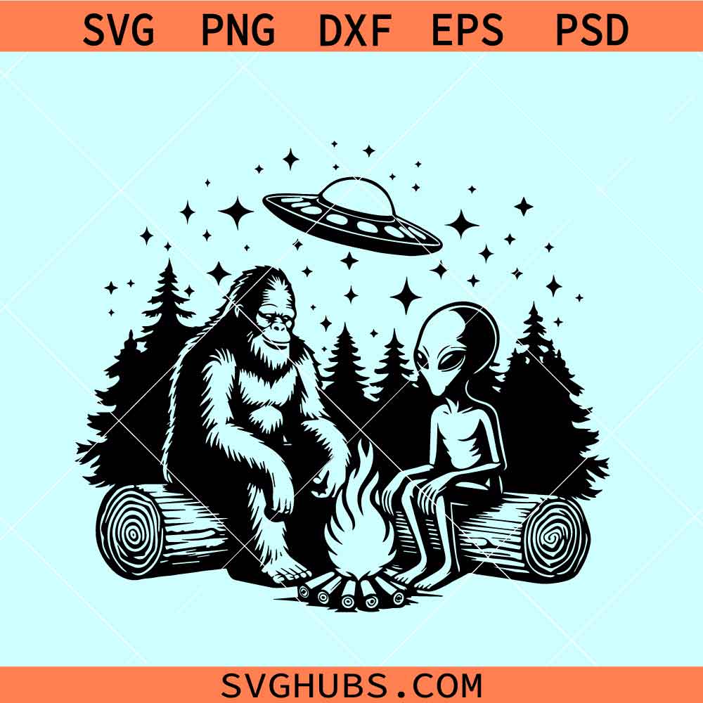 Bigfoot and Alien Sitting at a Campfire SVG, Bigfoot Alien Camping SVG, Bigfoot Alien Campfire SVG