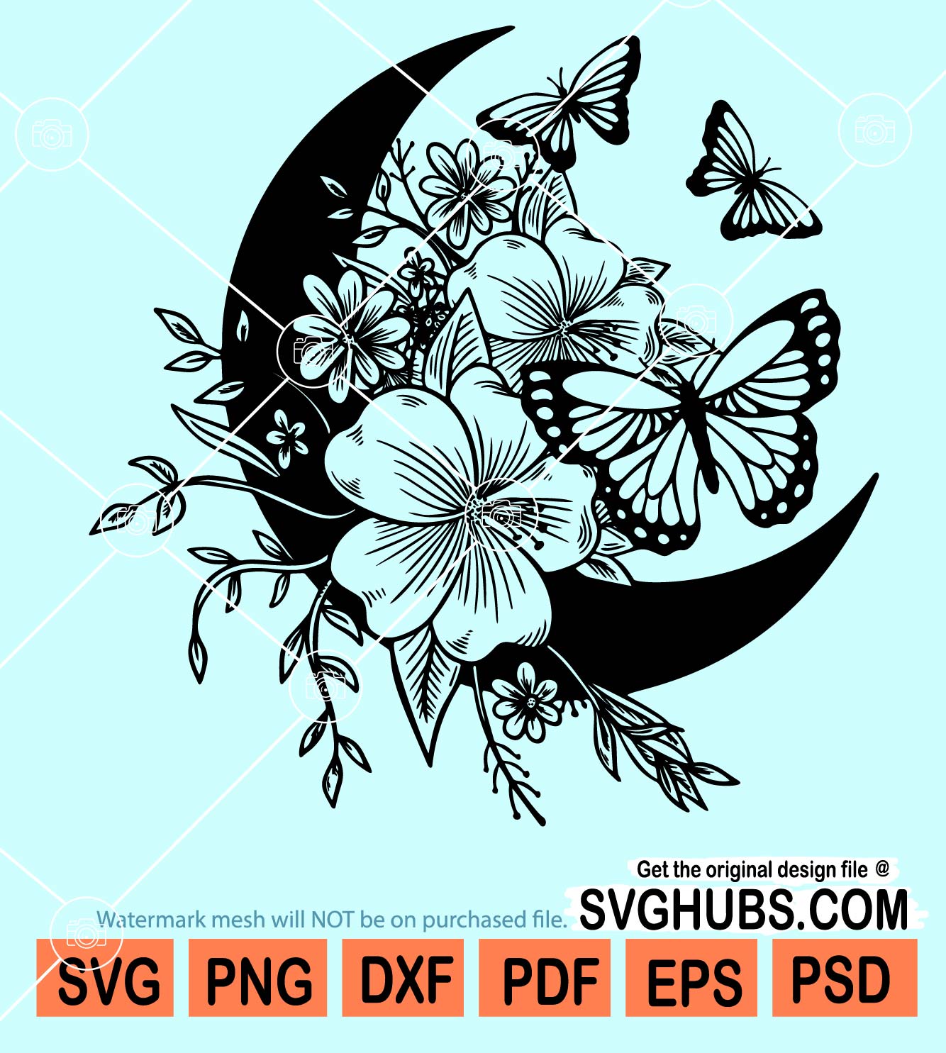 Floral crescent moon with butterflies svg, Floral moon svg, Flowers and Butterflies on moon Svg, Floral butterfly Svg, Flower moon svg, Celestial moon svg, mystical svg, Butterfly flower svg, Moon phase svg, SVG files for Cricut, SVG Hubs, and sublimation PNG files.