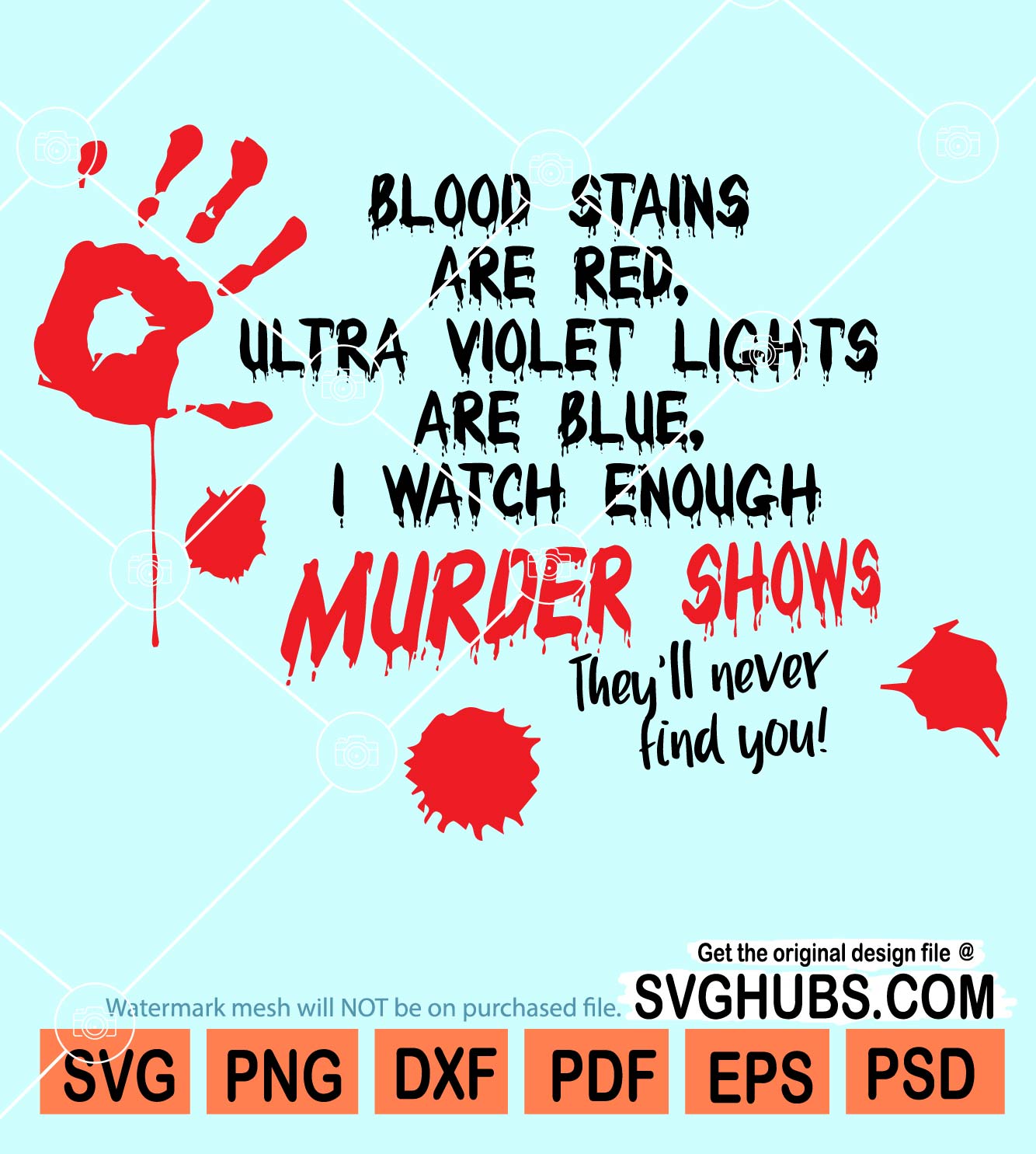 Murder shows svg, True Crime Svg, Murder Svg, True Crime Quotes Svg, Blood Splatters Svg, Blood Stains are Red Ultraviolet Lights are Blue I watch enough murder shows they’ll never find you svg, SVG files for Cricut, SVG Hubs, and sublimation PNG files.