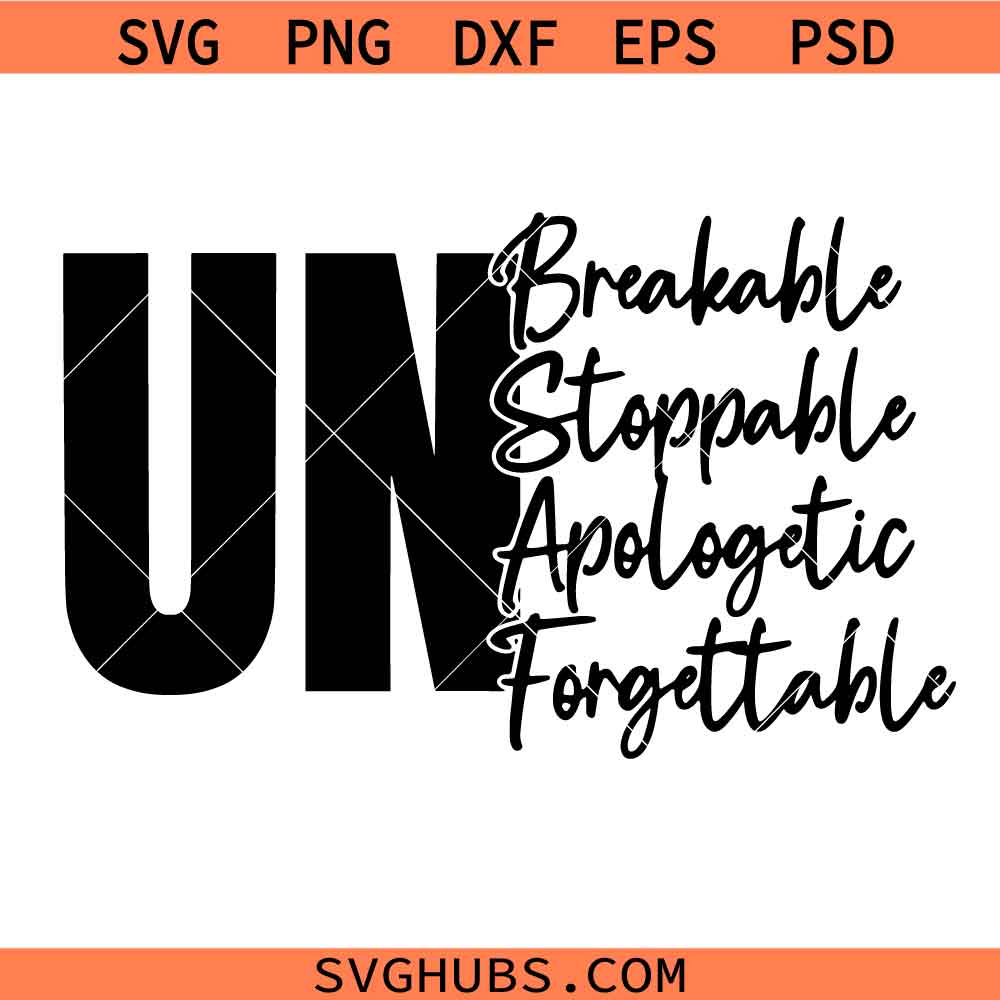 Un breakable svg png, Un stoppable svg png, Un apologetic svg png, Un forgettable svg png